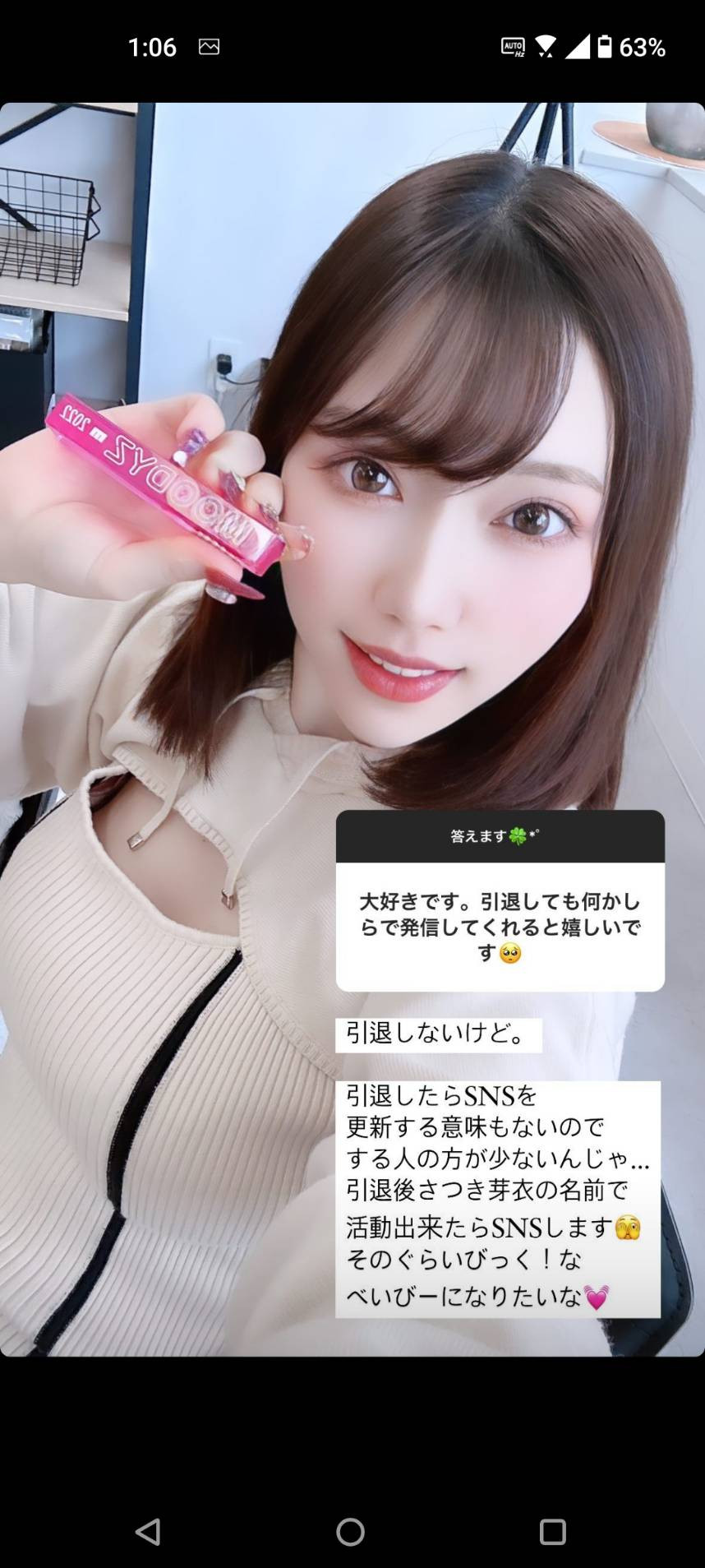 所以我能做的就是盯紧每一个女优,随着掌握她们的状况。像前一阵子讲的一副好像要把休业当引退的さつき芽衣(沙月芽衣)就改变心意了:
